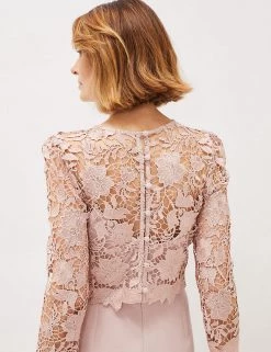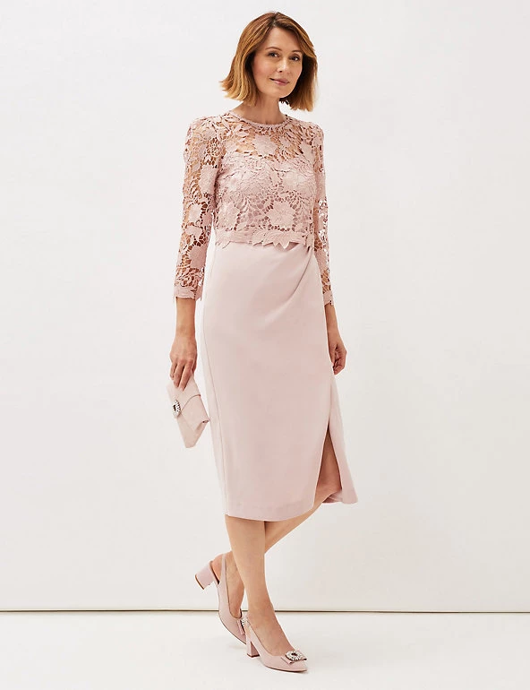 A delicate floral lace layer gives this classic shift dress from Phase Eight an eye-catching look. It’s cut to a comfy regular fit and has a rounded neckline and three-quarter sleeves for timeless style. The dress falls to the knee and the hem features a split for a sophisticated finish. A lining provides comfort, and it fastens with buttons on the back.