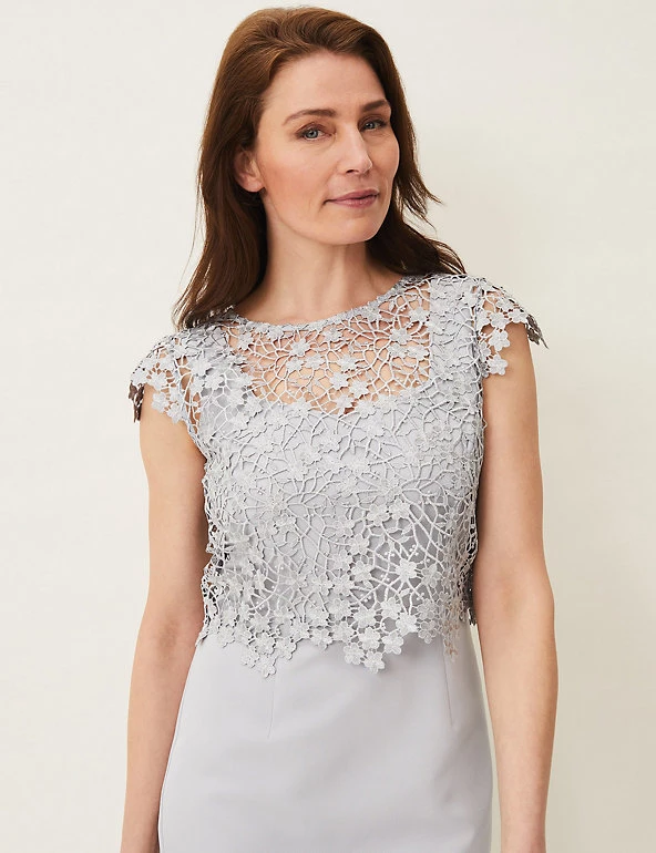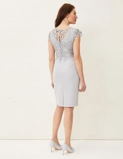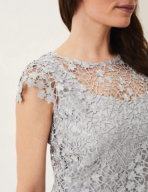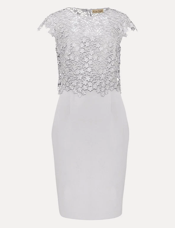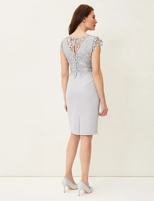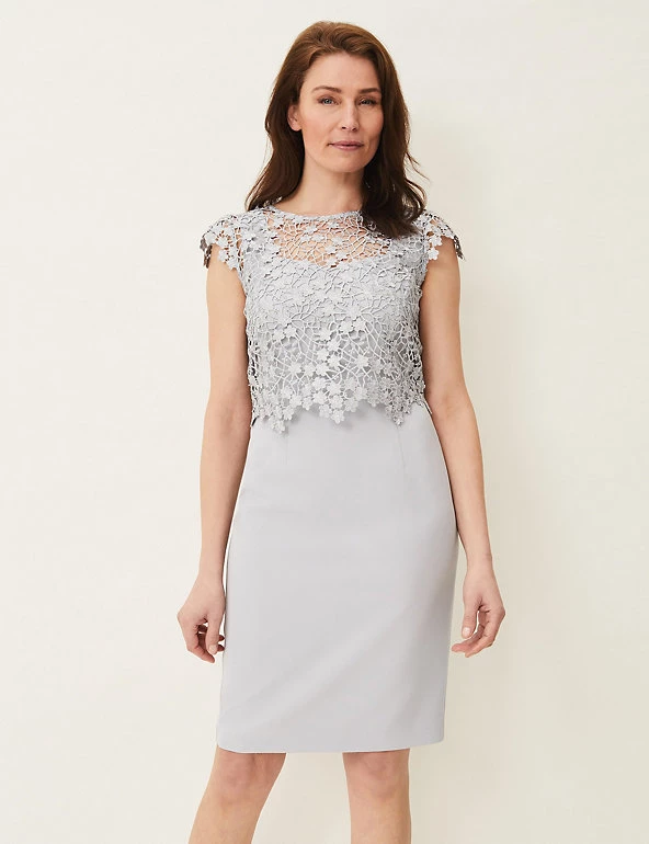 The delicate floral lace overlay on the bodice gives this Phase Eight dress a romantic feel. It has a fitted silhouette that falls to knee length. The round neckline and lace cap sleeves add demure detailing, while the woven lining ensures a smooth outline. The dress neatly fastens with a zip at the back.
