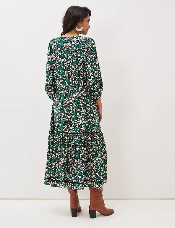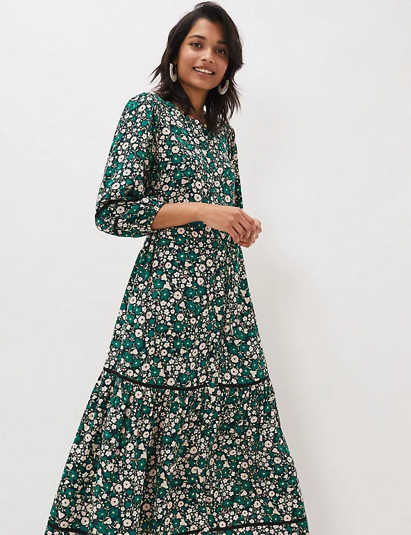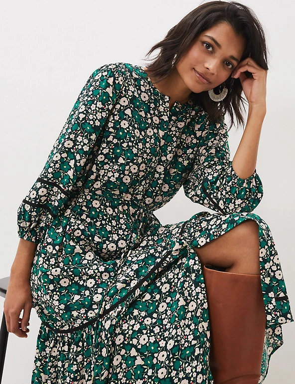 Breeze through your day in effortless style, in this floral print tea dress from Phase Eight. It’s cut in a comfortable regular fit, with an easy round neckline and an on-trend midaxi length hemline. At the waist, a slender tie belt ensures a flattering silhouette. The three-quarter sleeves are gathered at the shoulders and cuffs for a touch of pretty fullness. The skirt is tiered to add movement, and contrast trims give subtle detail. The dress fastens with neck-to-hem covered buttons.