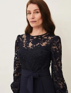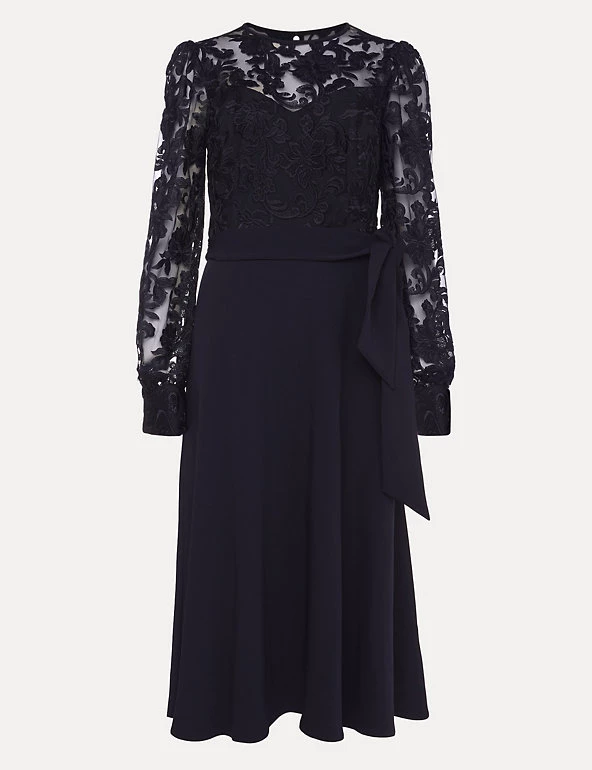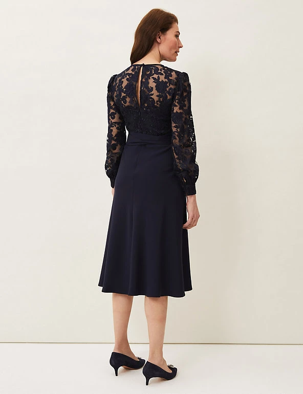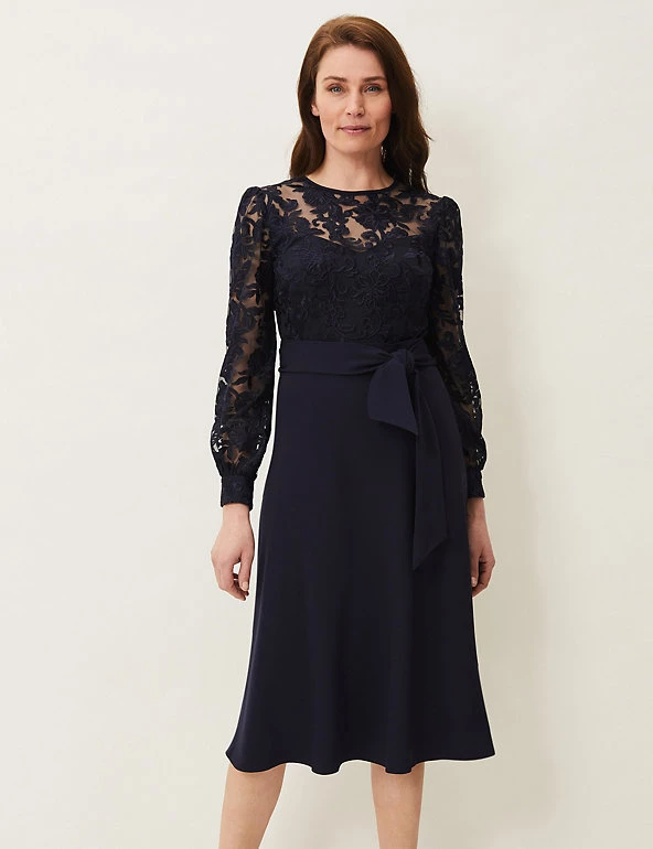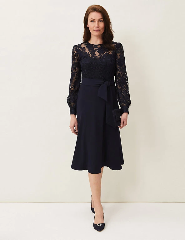 The sumptuous lace on this Phase Eight midi dress gives it a sophisticated look. This shift style is cut to a regular fit and has long cuffed sleeves. The round neck top is made from detailed floral lace that sits over a plain bustier-style bodice, which flows down into the flared skirt. A tie belt enhances the waist for a flattering finish. The dress is fully lined for comfort and fastens with an easy zip closure.