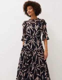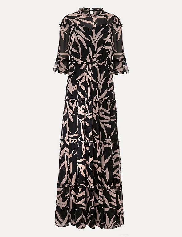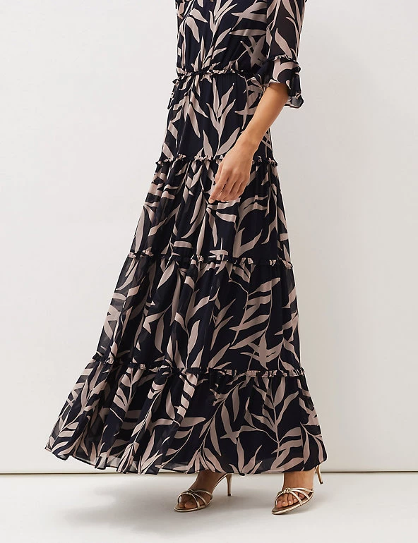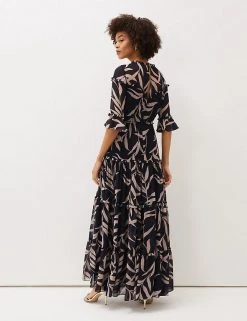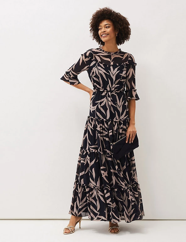 With a tumbling tiered silhouette and bold leaf print, this Phase Eight maxi dress is a wardrobe winner. It’s designed in a classic regular cut with a neat round neck and flattering three-quarter sleeves. Ruffle detailing on the collar and cuffs add feminine flourishes. This striking piece is lined for comfort and fastens with an easy zip closure.
