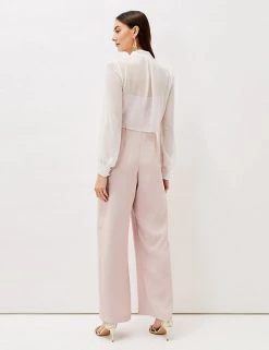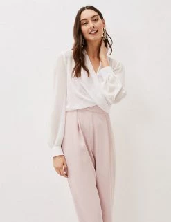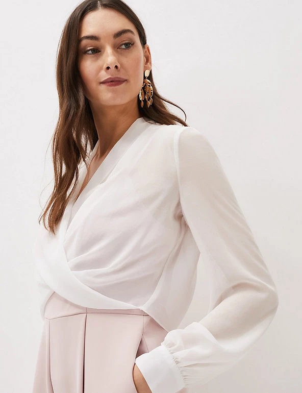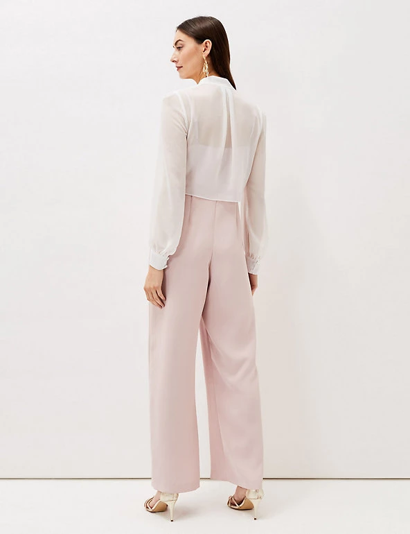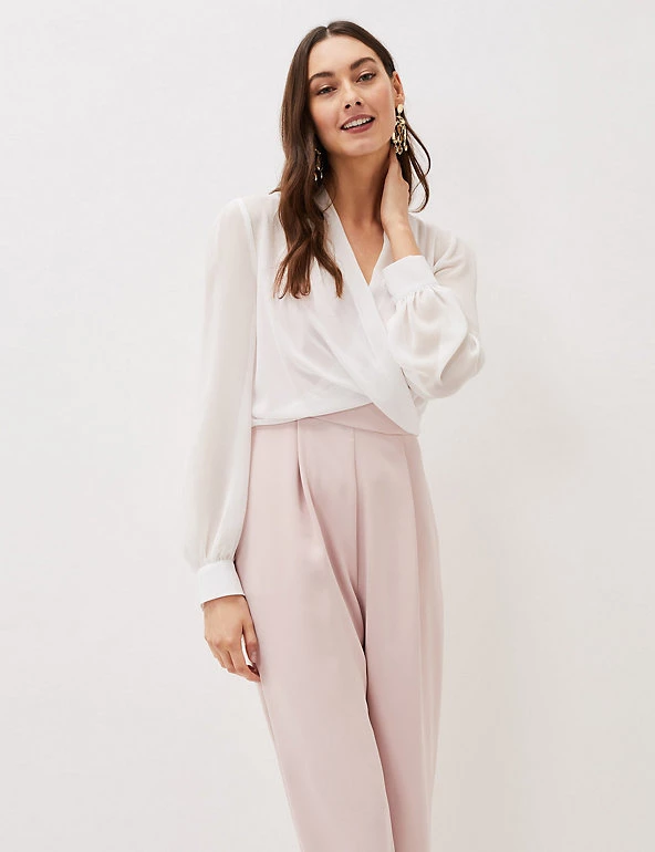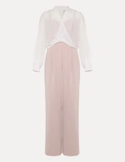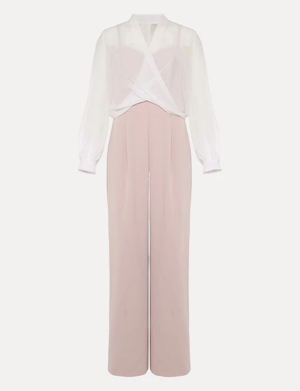 Go for understated elegance at smart occasions with this v-neck jumpsuit from Phase Eight. It’s cut in a classic regular fit and is lined for comfort. This refined piece features a sheer top with a flattering wrap shape and long sleeves with smart buttoned cuffs. The contrast fabric trousers are finished with a cool wide leg.
