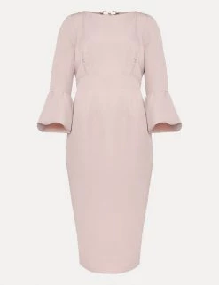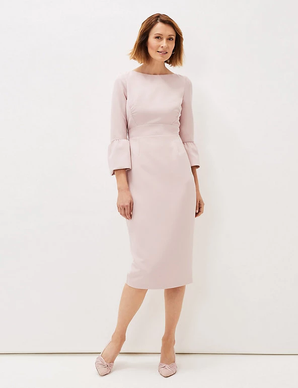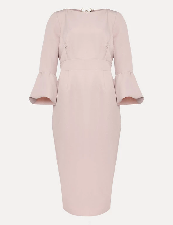 Fluted three-quarter length sleeves lend a statement look to this Phase Eight dress. This figure-skimming bodycon style is cut to a comfortable regular fit and falls to a flattering midi length. A rounded neckline adds a classic touch and the elegant v-shaped open back is held together with a gold-tone metal bow. This dress fastens with a discreet zip.