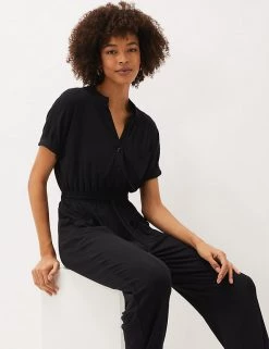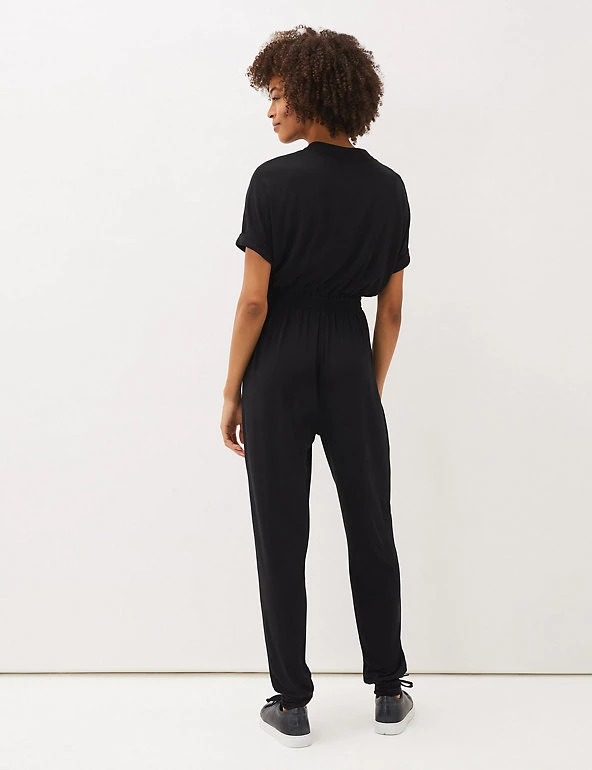 Tackle busy off-duty days in effortless style with this modal-rich jumpsuit from Phase Eight. This utility-inspired design features buttons down the bodice, a flattering drawstring waist and snug cuffed hems. The v-neck adds a feminine touch, while the short sleeves provide a neat finish.