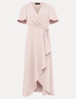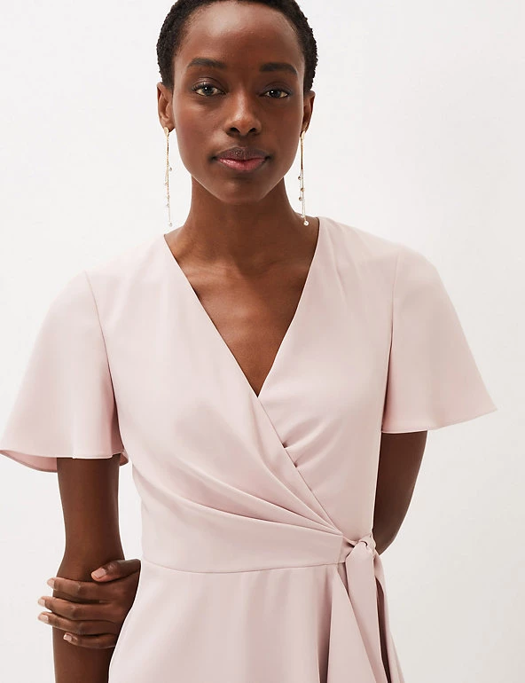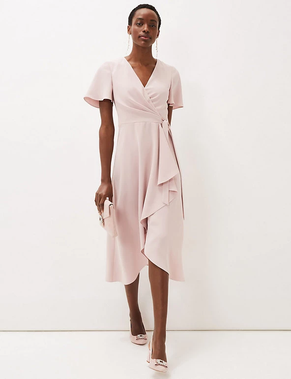 This midi dress from Phase Eight is a sophisticated occasion piece. It’s cut in a regular fit with a tie at the waist creating a flattering silhouette. Wrapping over at the front for a more shapely outline, the dress is elevated with a romantic frill. The short angel sleeves offer further feminine flourishes.