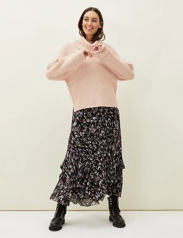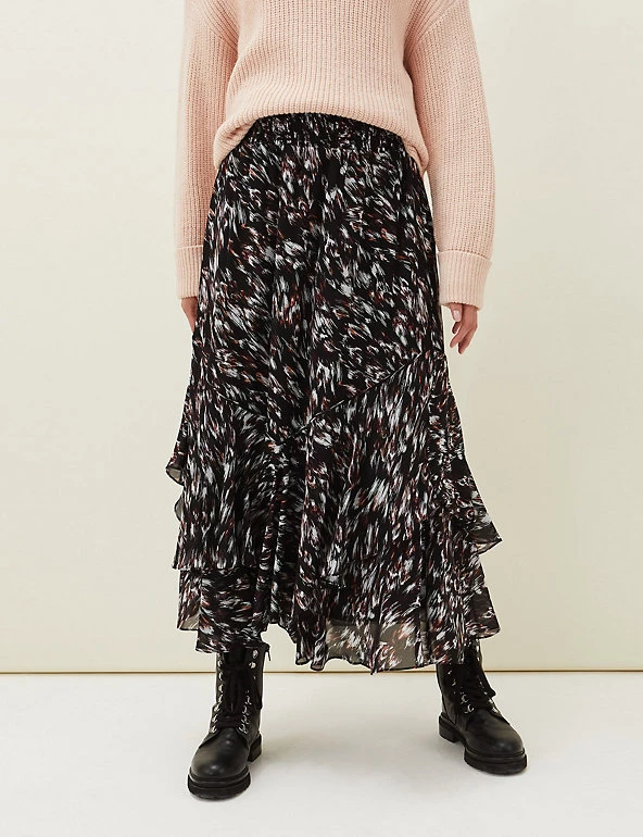 This tiered skirt from Phase Eight offers a floaty feel and statement style. It’s cut to an on-trend midaxi length and features an all-over abstract print. The asymmetric hemline gives the skirt some extra edge. It’s fully lined for comfort and fastens with a concealed zip. Made with recycled polyester.