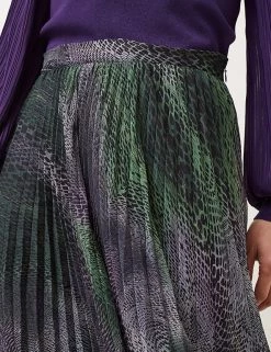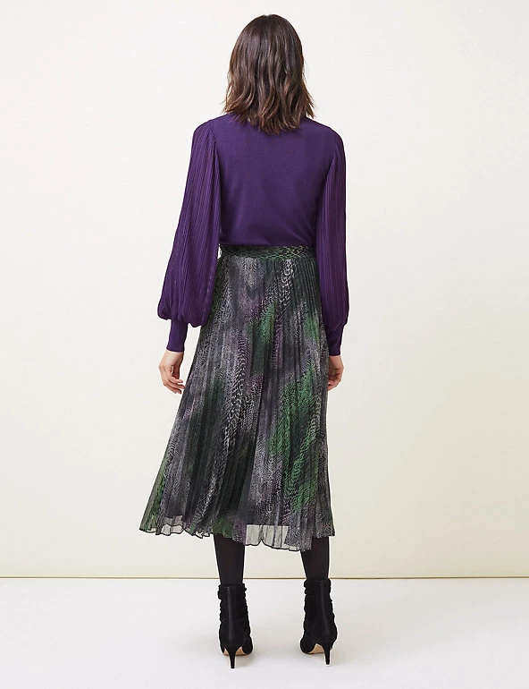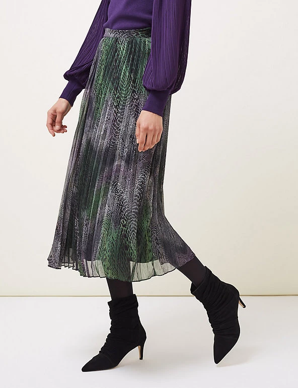 Swish through smart days in this stylish snake-print skirt from Phase Eight. This modern skirt is pleated for extra movement and is cut to a flattering midaxi length. Feel comfortable all day thanks to the elasticated waistband. It’s finished with full lining for complete coverage. Made with recycled polyester.