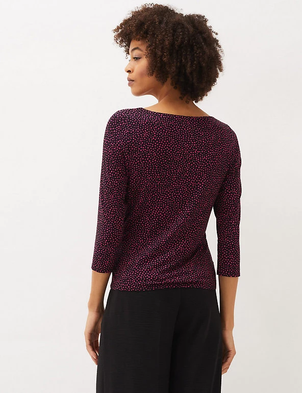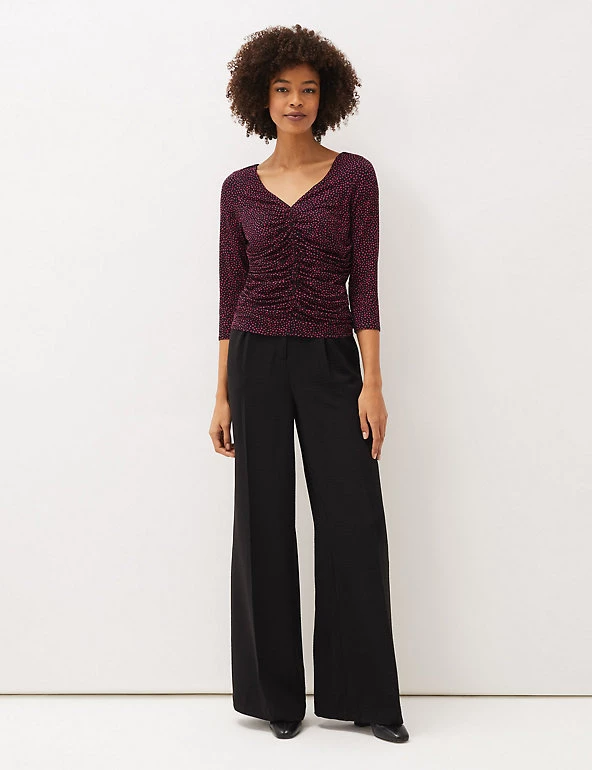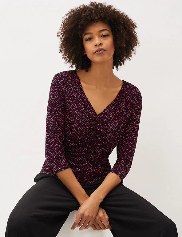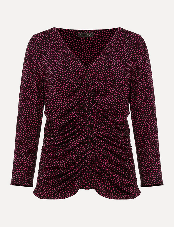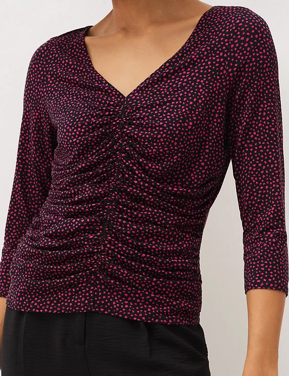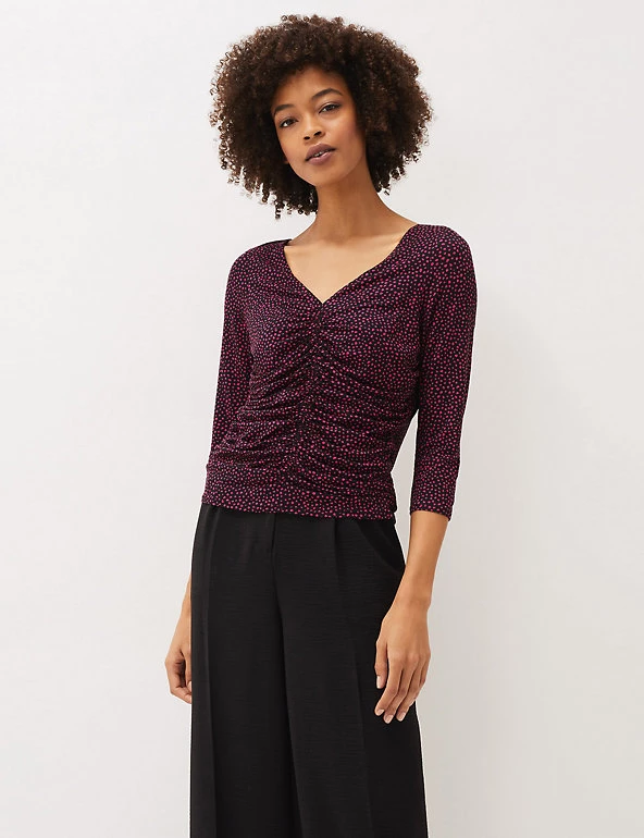 This Phase Eight top features a ruched front for a flattering look. It’s cut in an easy regular fit, with a feminine v-neckline and three-quarter sleeves. Added stretch ensures a smooth, comfortable wear, and the all-over polka dot print gives a fresh and dainty feel.
