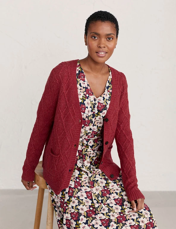 Layer on extra warmth and style with this merino wool-rich cardigan from Seasalt Cornwall. It’s designed in a regular fit, with a classic v-neck shape to complement any ensemble. The diamond-stitch knit adds distinctive texture to your outfits, while ribbed trims give a wonderfully snug feel.