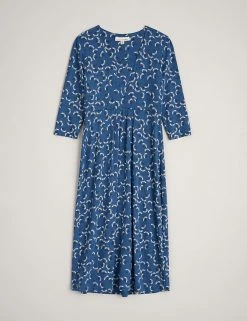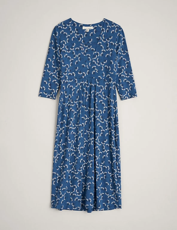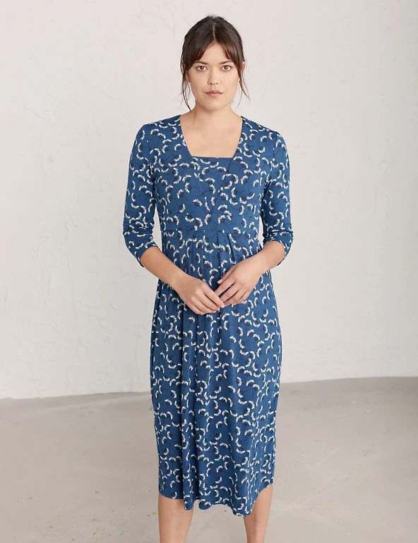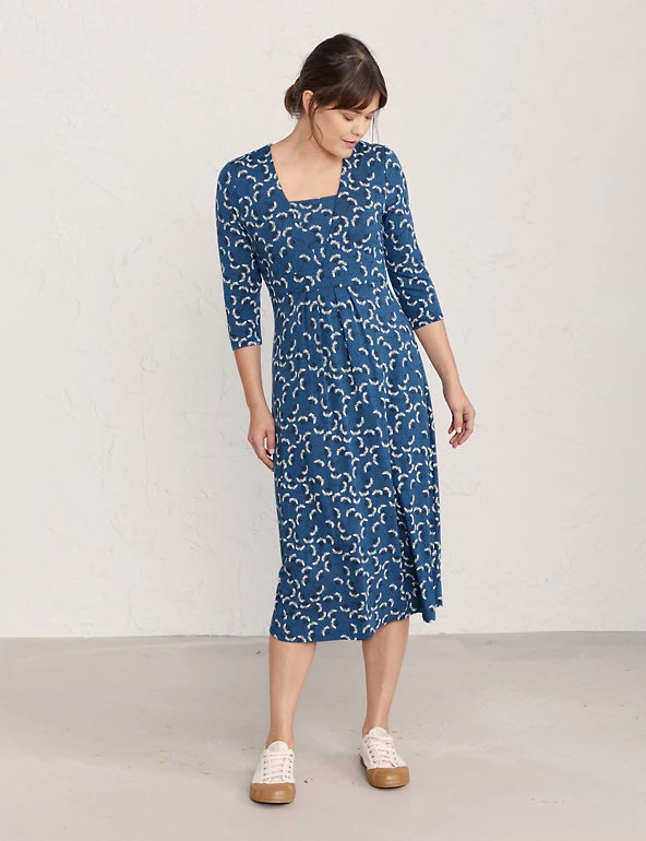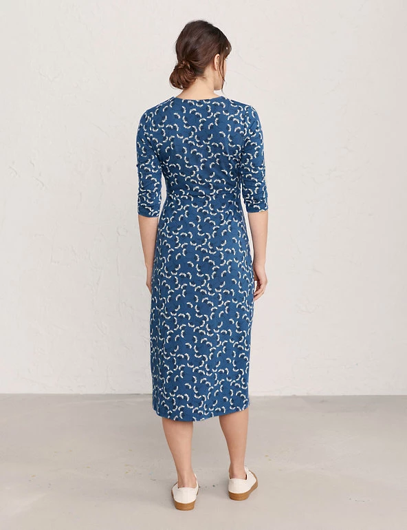 This jersey midi dress from Seasalt Cornwall is a flattering wardrobe staple. Designed in an easy regular shape, the fabric is crafted with added stretch for the perfect fit. The dress features a feminine deep v-neckline with an inserted panel for extra coverage and an underbust band to define your waist. It’s decorated with a delicate floral print and finished with three-quarter sleeves. Made with organic cotton.