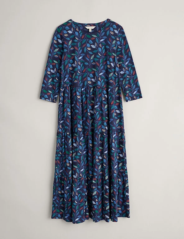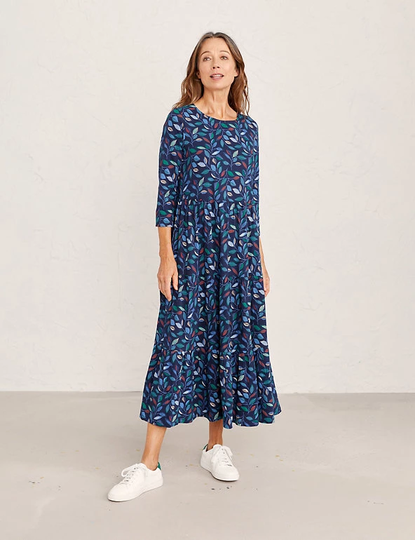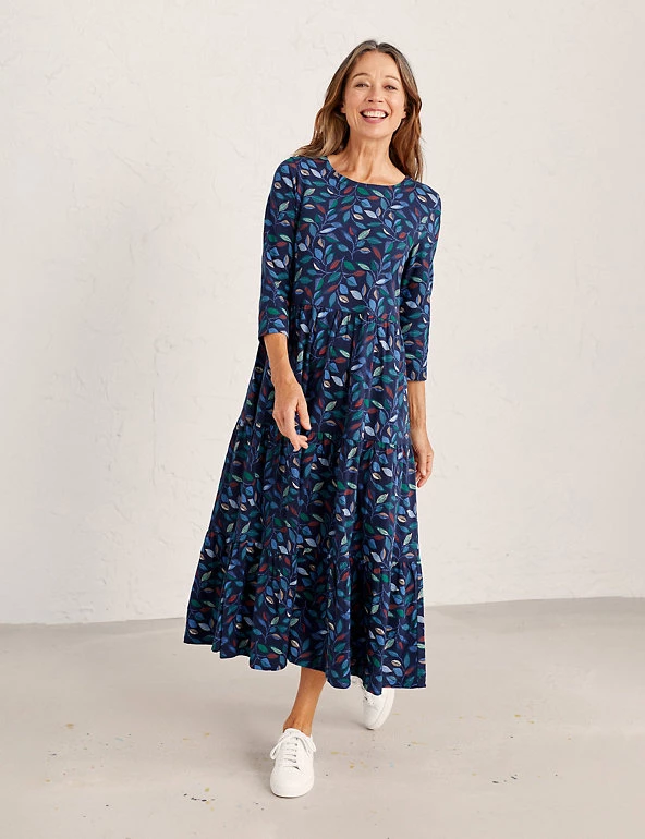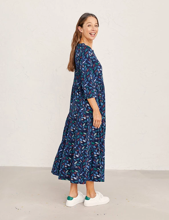 Embrace the instant outfit with this pure cotton midi dress from Seasalt Cornwall. Designed to flatter, this throw-on-and-go style is cut to a relaxed fit with a waist seam and 3/4 length sleeves. A tiered skirt gives this feminine piece a floaty finish, and the all-over leaf print is perfect for everyday wear. Made with organic cotton.