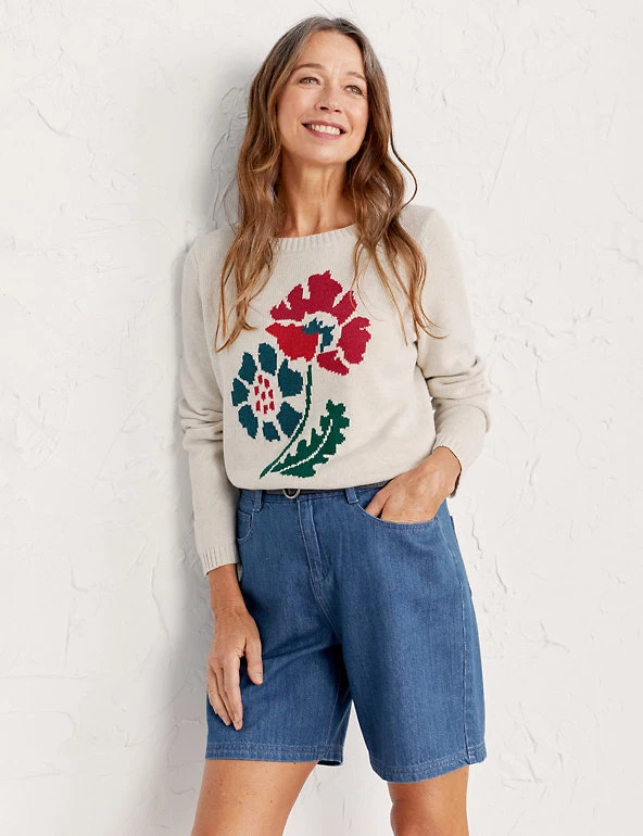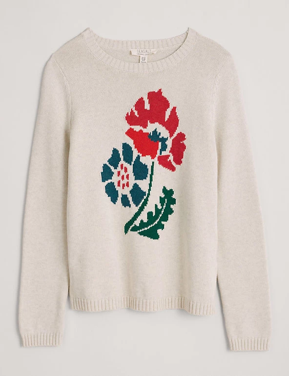 Feel the freshness of spring in this pure cotton Seasalt Cornwall jumper. Cut to a regular fit, it features a classic crew neck and snug ribbed trims. The statement floral design on the front adds colour and interest to this comfy piece. Made with organic cotton.