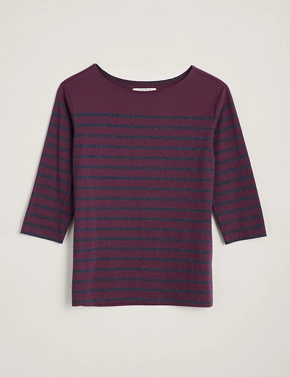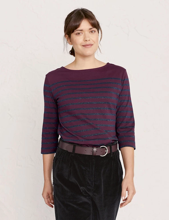 The classic Breton top gets a shimmering update with this cotton-rich design from Seasalt Cornwall. Cut in a comfy regular fit, the top has a timeless boat neckline and 3/4 length sleeves. The stripes are yarn-dyed for a crisp finish. Made with organic cotton.