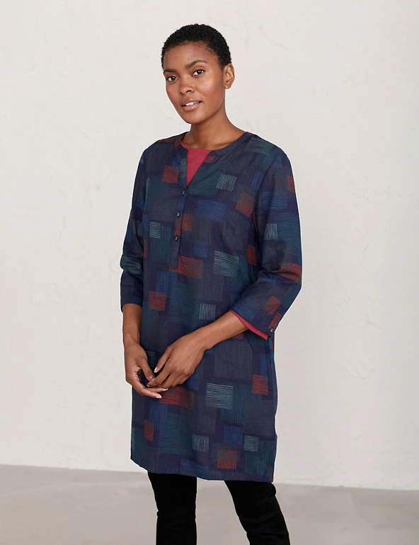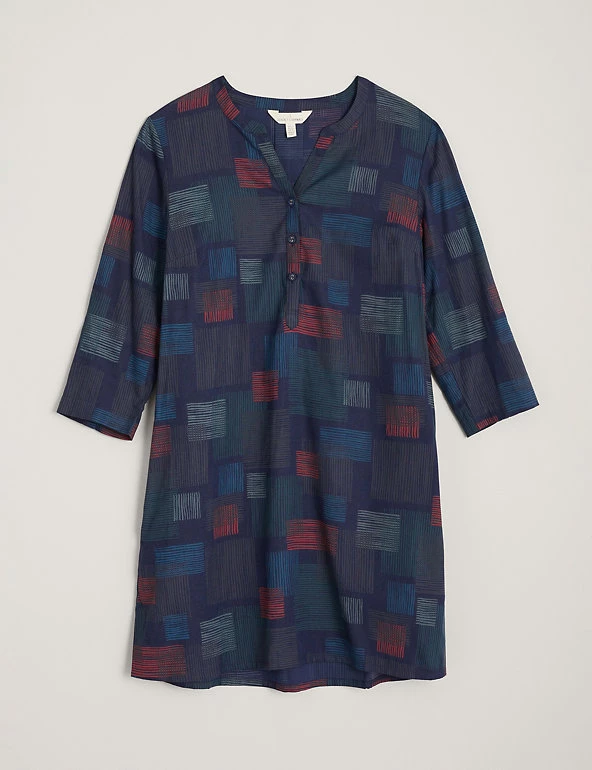 This flattering tunic from Seasalt Cornwall is crafted from cotton-rich fabric for comfortable all-day wear. It’s cut to an easy regular fit and features a dart on the back for extra shaping. Three-quarter length sleeves and a v-neckline create a classic look. An abstract print gives a coastal-inspired feel.