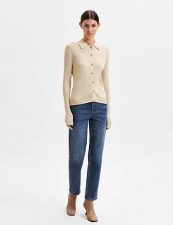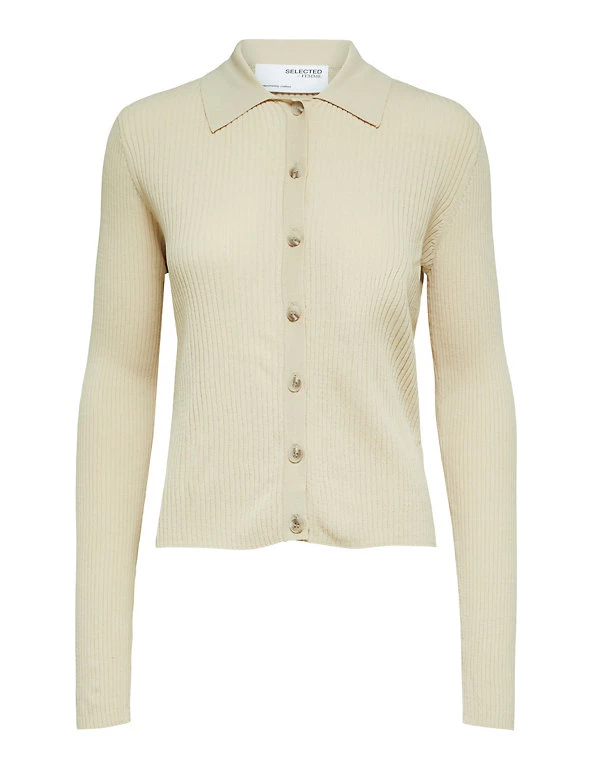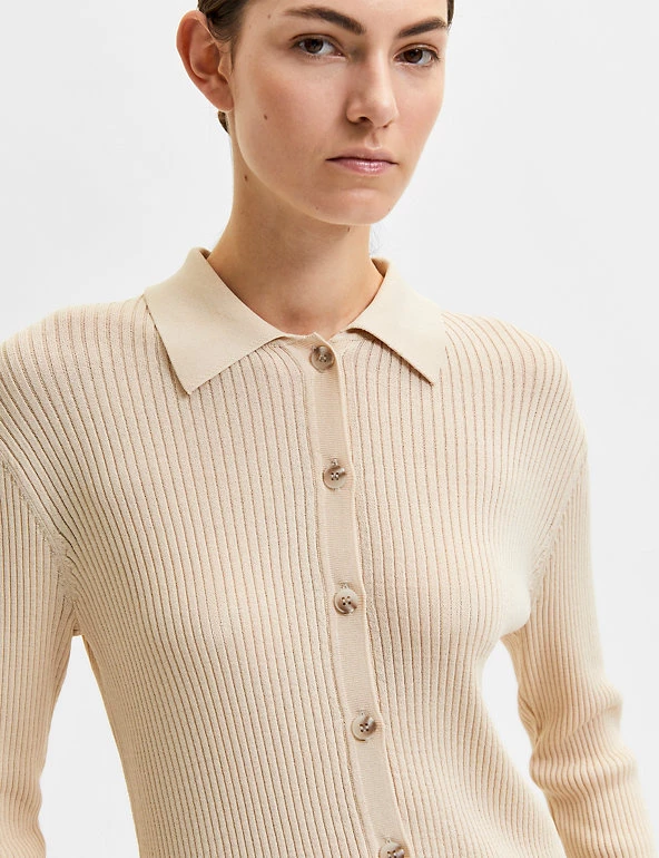 This cosy cardigan by SELECTED FEMME sports a modern rib-knit texture. Fitted for a flattering look, this versatile piece features a smart collared neck and warm long sleeves. Contrast buttons down the front bring a contemporary finishing touch.