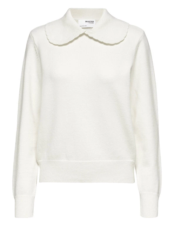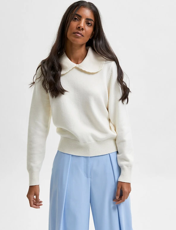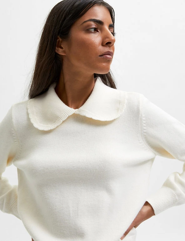 A statement oversized v-neck collar gives this SELECTED FEMME jumper plenty of contemporary appeal. Designed in a regular fit, the cosy long-sleeved pullover sports a delicate knitted texture and is finished with a ribbed trim along the hem and cuffs.