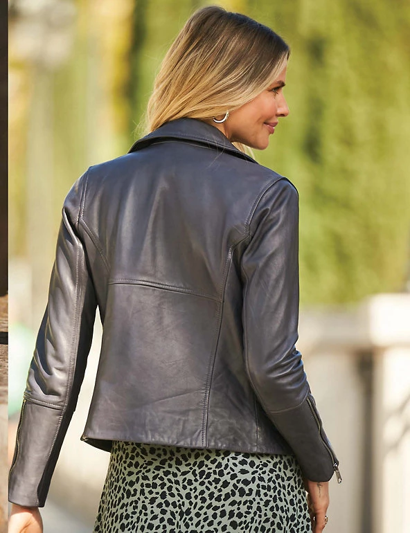 An all-time classic, this Sosandar biker jacket is made from supple leather. Itβs cut to a comfortable regular fit and sits at the hips. The jacket features a chic collared neckline and an asymmetric front zip, while zippers on the sleeves and pockets add to its edgy appeal.
