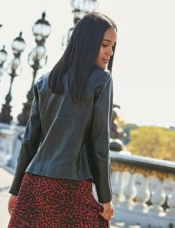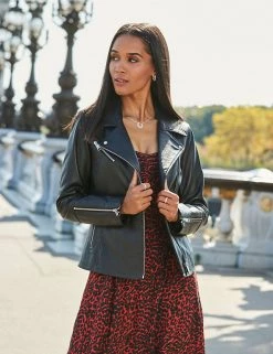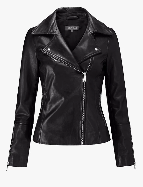 This biker jacket from Sosandar will add some serious style to your outerwear. It’s crafted from lamb leather in a flattering and comfortable regular fit. It features handy zipped pockets on the sides and chest. Sleeve zips and subtle studs on the notched lapels complete the piece.
