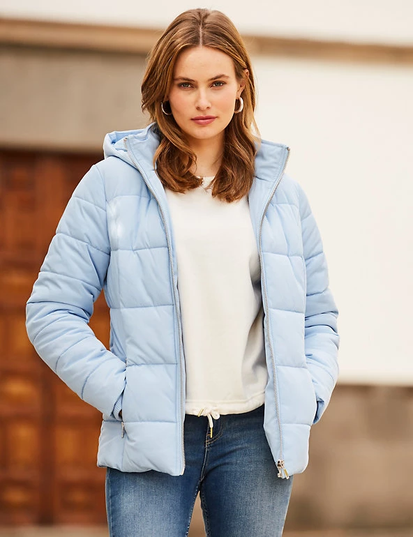 This on-trend puffer jacket from Sosandar ensures you beat the chill in effortless style. It’s cut in a comfortable regular fit with an easy zip-through fastening. A funnel neckline keeps out draughts and the hood gives extra protection when needed. Two vertical zip-up pockets at the waist keep your valuables secure.