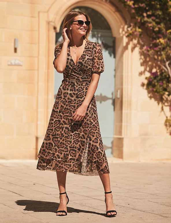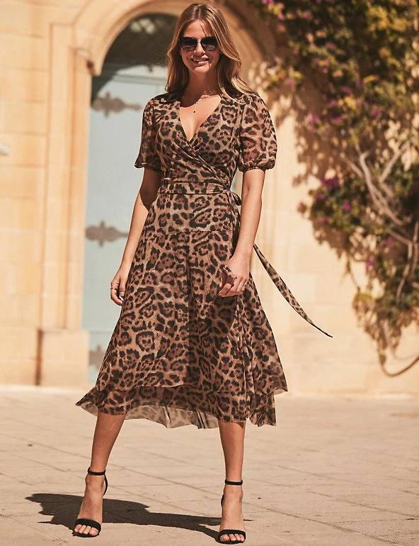 Stand out from the crowd with this leopard print wrap dress from Sosandar. It has short sleeves and a flattering v-neck, with a midi length that makes it ideal for everyday wear. The wrap around the waist makes for a fitted, feminine silhouette, while the animal print adds to the fun and bold look.