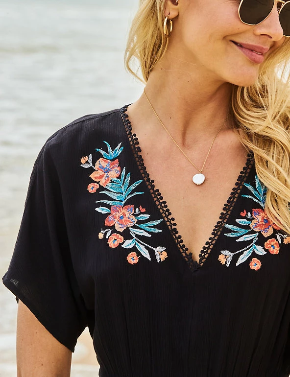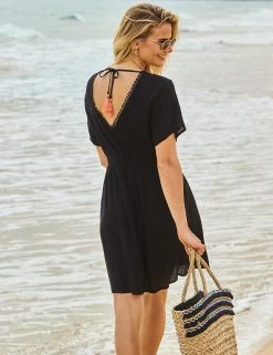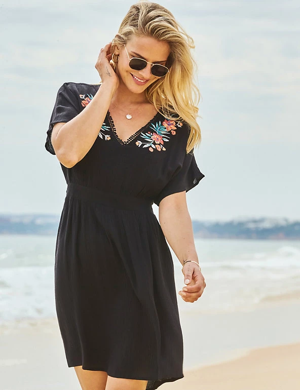 Feel effortlessly glamorous in this short-sleeve beach dress from Sosandar. Its regular fit is enhanced with a shirred waistline, and the feminine v-neck is trimmed with delicate lace. Tropical floral embroidery on the bodice gives it a dreamy holiday air. At the open back, lacy trimmings and a dainty tie at the neck give the finishing touches. The hemline finishes at a flirty mini length.