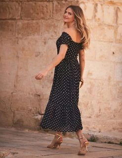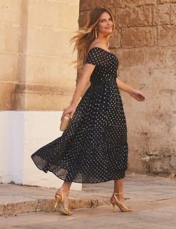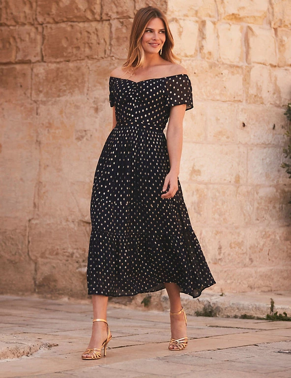 Keep this short-sleeved skater dress by Sosandar on standby for special occasions. Its fitted design and banded waist help to flatter your figure and the tiered hem gives an on-trend touch to the midi skirt. The eye-catching Bardot neckline gives elegance, while the ruched front adds a touch of texture. Shimmering polka dots complete the dazzling look.