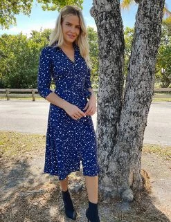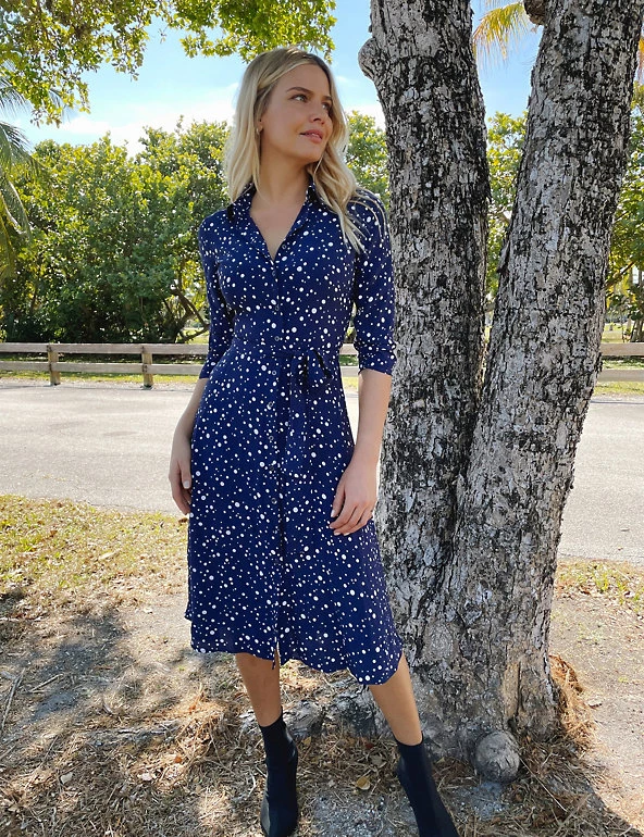 This shirt dress from Sosandar is the ultimate in versatile style. It’s cut in an effortless regular fit, with flattering three-quarter length sleeves and a v-neck. It falls at the knee and is finished with a matching waist tie to enhance the silhouette. This design is complete with a classic collar and button fastenings, plus an all-over polka dot print.
