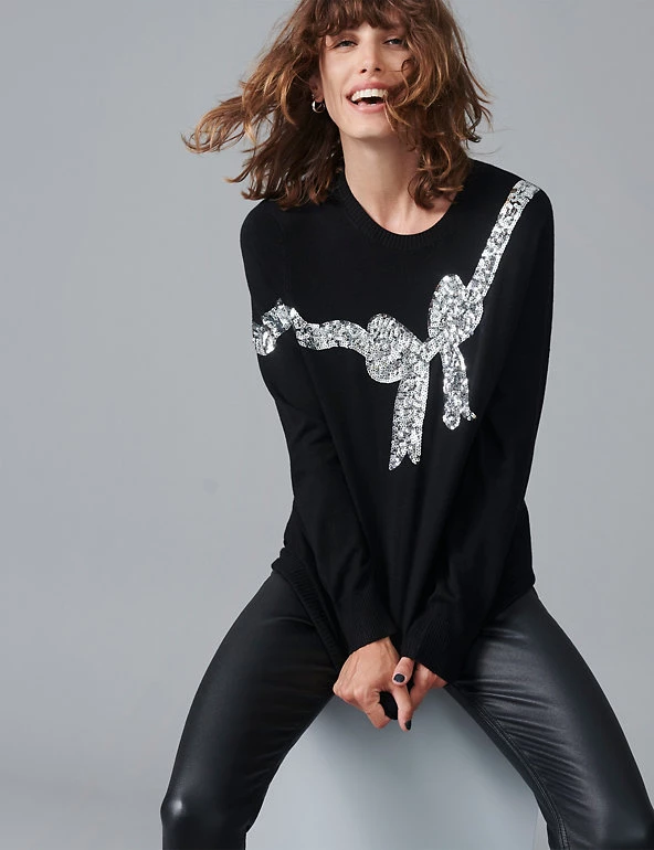 Jazz up your winter wardrobe with this festive jumper from Sosandar. It’s cut in a regular fit with a classic crew neck and long sleeves. The jumper features a trailing sequin-embellished bow for a standout shimmering look.