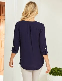 Create an elegant everyday look with this tunic from Sosandar. This longline shirt is cut to an easy regular fit, with a v-neck and a gold-tone half zip. Gentle gathers at the back give a flattering silhouette. The three-quarter length sleeves feature gold-tone studs on the rolled cuffs for a touch of utility chic.