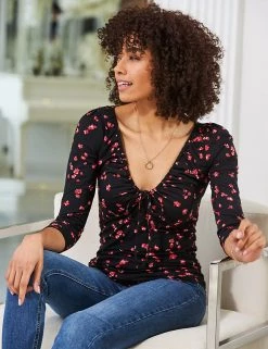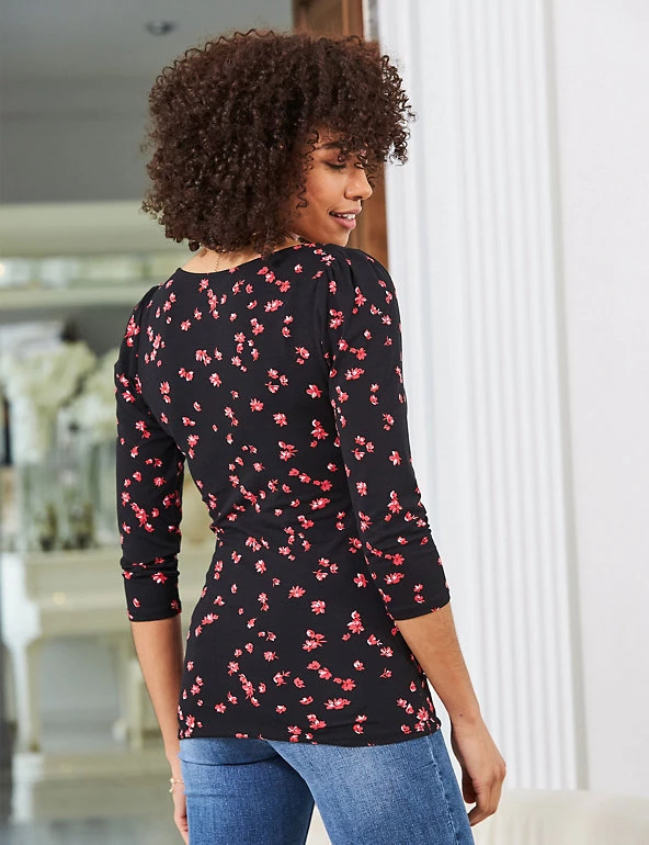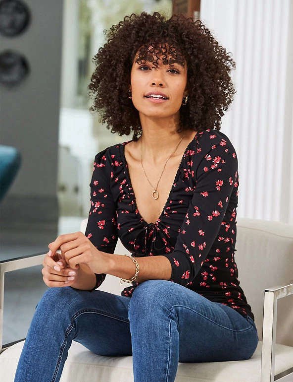 Add to your collection of always-on-trend florals with this beautiful top from Sosandar. This fitted three-quarter length sleeve style has a matching tie on the bust, creating a ruched effect along the elegant v-neckline. It’s printed throughout with a delicate ditsy floral print for a feminine finish.