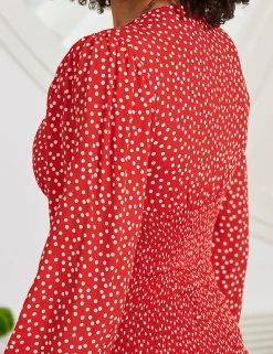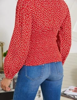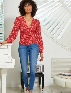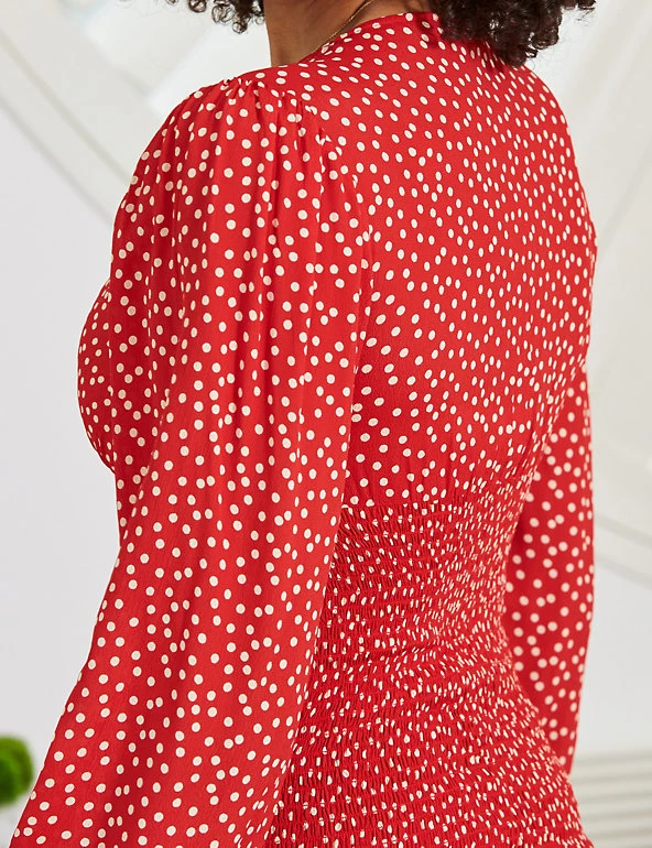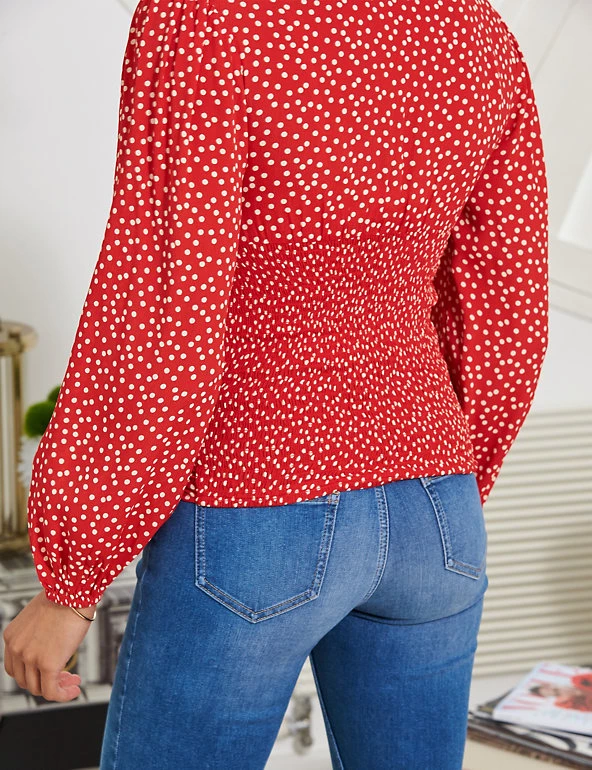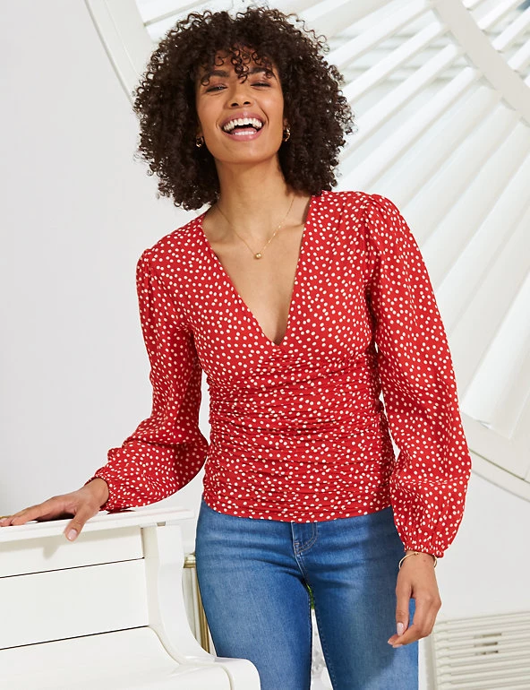 This dress-up, dress-down top from Sosandar is designed to flatter. It’s cut in a fitted silhouette, with long blouson sleeves and a v-neck with seam detailing under the bust. A playful spot print and textured ruching complete this on-trend top.