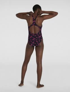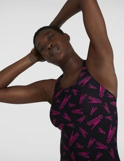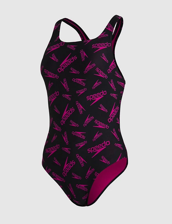Stand out from the lanes in this bright swimsuit by Speedo. An all-over print of the iconic brand logo livens up this regular-fitting piece, while a scoop neck enhances your silhouette. The functional design features a medium back and leg cut to aid flexibility. Added stretch gives this fully-lined swimsuit an extra comfortable feel.