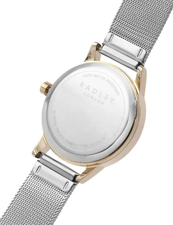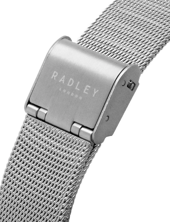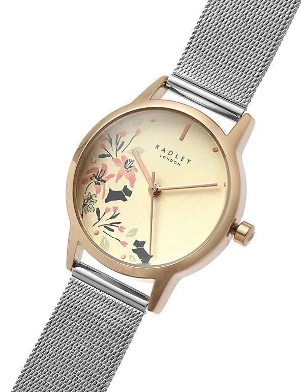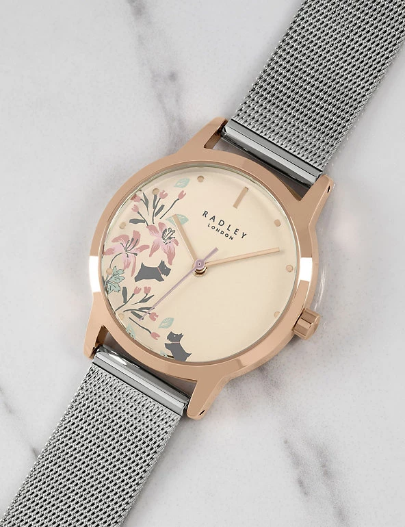 With its contemporary mix of metals, the Radley Botanical watch makes a stylish addition to your collection. The rose-gold plated bezel houses a delicately painted dial showing the brand’s signature Scotties playing among flowers. Polished spots mark the hours, with a baton at the 12 o’clock position. The silver-toned mesh bracelet is made of stainless steel, and fastens with a clasp.