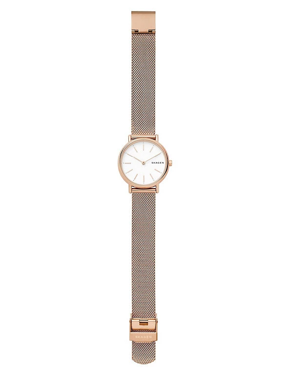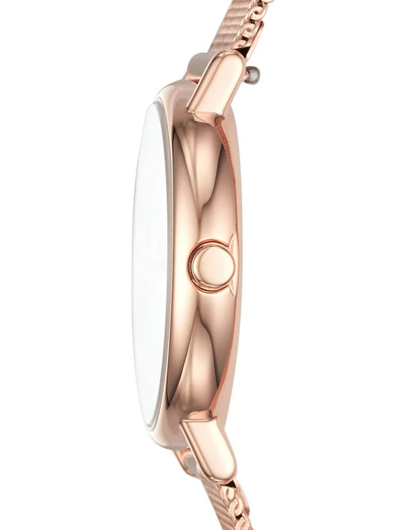 The rose-gold Signatur watch by Skagen is a lesson in understand elegance. Its dial is minimally designed with slender hour markers and arms, and the brand name at 3 o’clock. Complete with a metal mesh bracelet that fastens with an adjustable clasp, this timepiece lends a delicate look.