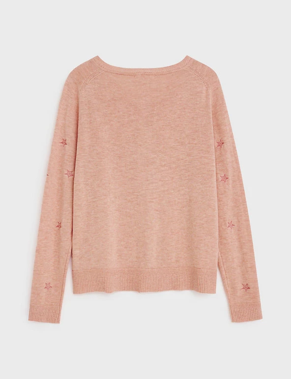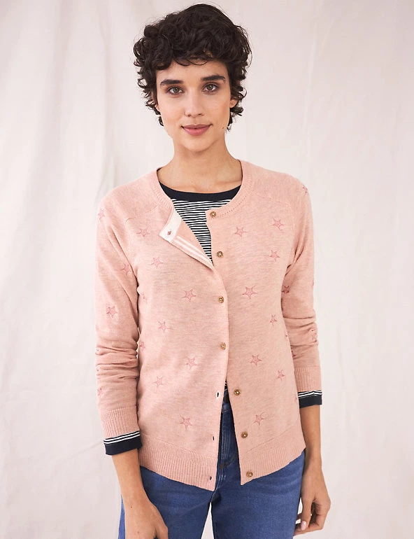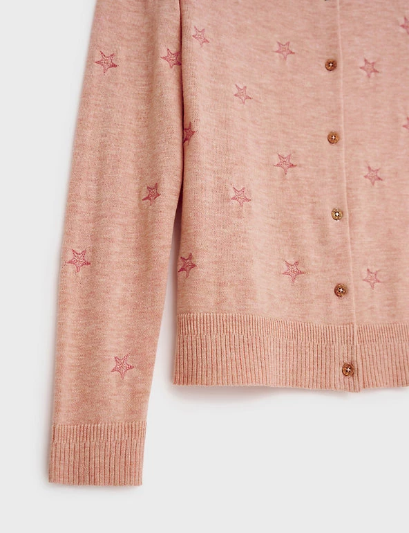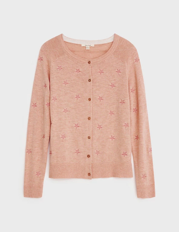 With its all-over embroidered star design, this pure cotton cardigan from White Stuff brings extra interest to your casual outfits. It’s knitted in an easy regular fit, with a crew neckline and cosy ribbed cuffs and hem. Contrast button fastenings add subtle detail. Made with organic cotton.