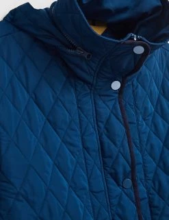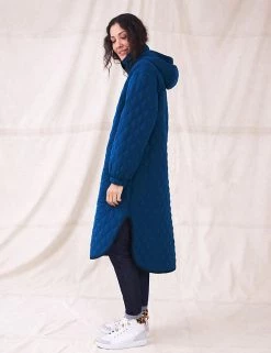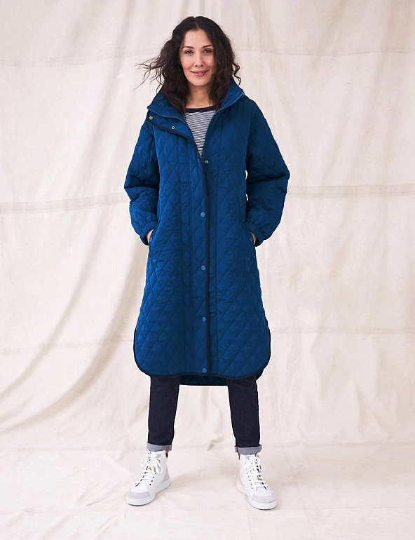 Keep out the chill with this longline quilted coat from White Stuff. It’s cut to a regular fit for comfort, with a cosy high neck and side pockets. Elasticated cuffs and a popper and zip fastening further protect you from the elements. This puffer jacket features a practical hood that can be zipped away into the collar.