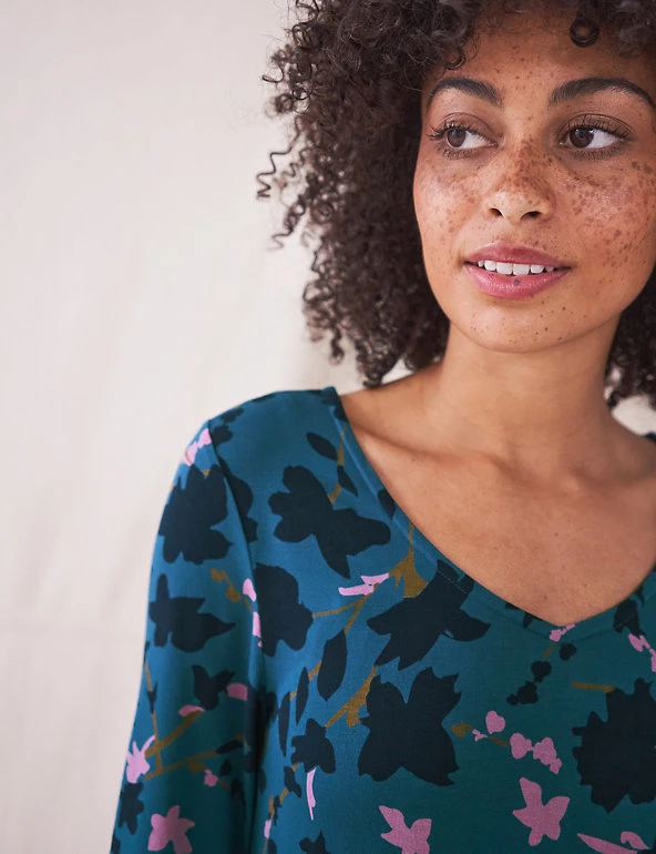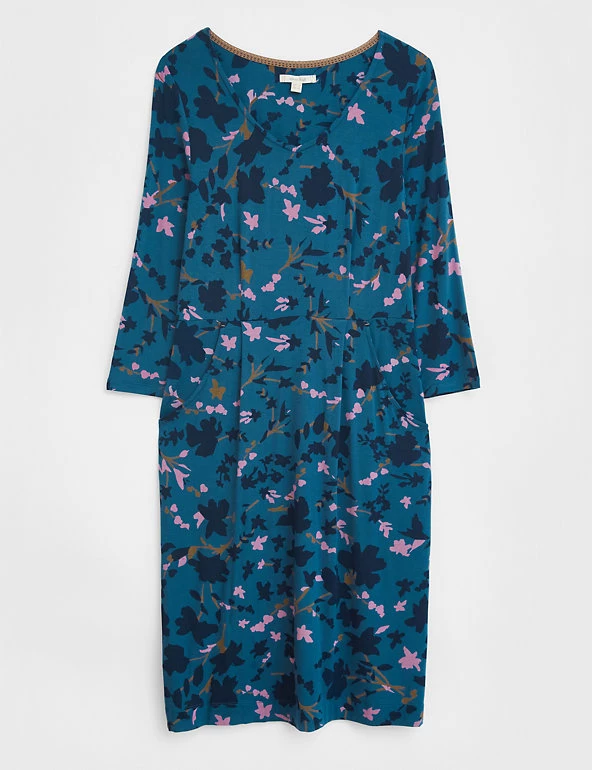 This waisted jersey dress from White Stuff is printed with a bold floral design for a standout look. It’s cut in a comfortable regular fit, with a go-anywhere knee-length hem. Added stretch gives easy comfort, while the v-neckline and three-quarter sleeves ensure a feminine air. Useful storage comes from pockets at the hips. Made with sustainably sourced viscose.
