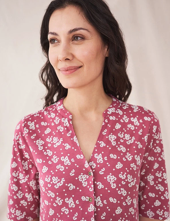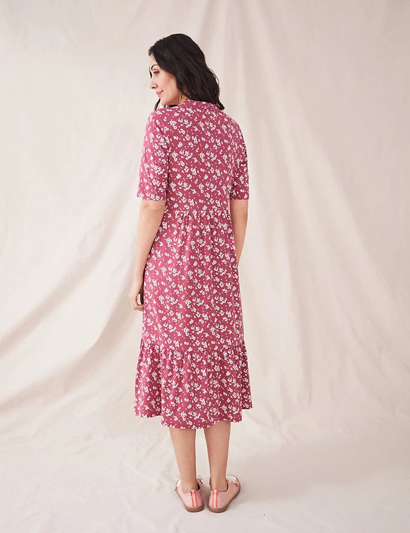 An all-over floral print gives this elegant cotton-modal waisted dress from White Stuff a fresh feel. It’s cut to a flattering regular fit and flows to a midi length, with a tiered hem detail for extra shaping. Short sleeves give a laid-back look, and it’s finished with a sophisticated v-shaped neck and button fastening.