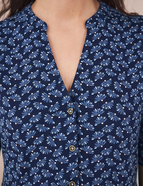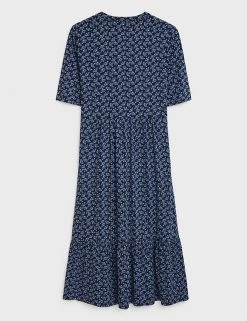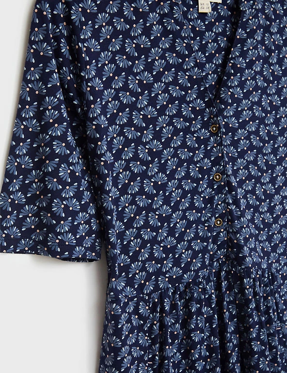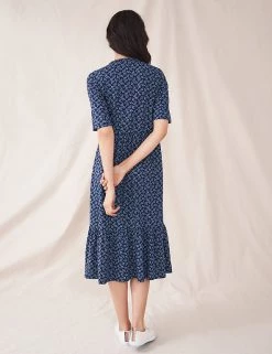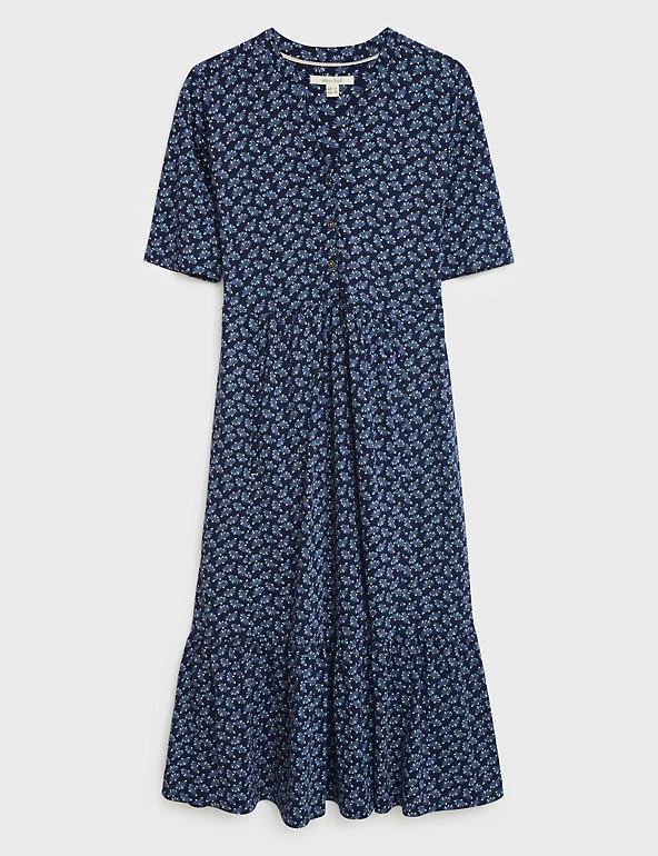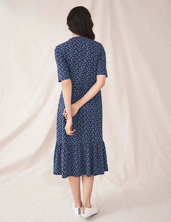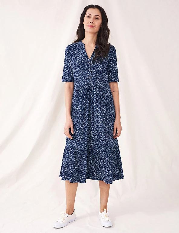 Drapey cotton-blend fabric and a flowing silhouette come together to create this summery midi dress from White Stuff. It comes in a regular fit, with a button-up bodice and tiered hem. The dress features a delicate daisy print and is complete with an elegant open v-neckline and short sleeves. Made with organic cotton.
