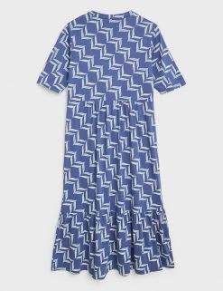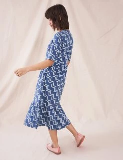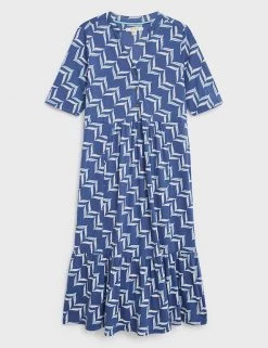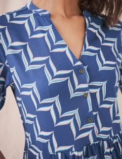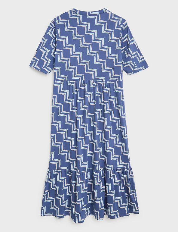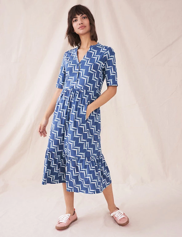 Step out in a bold geometric print with this organic cotton-blend dress by White Stuff. It’s crafted in a regular fit, with a tiered hem that falls to midi length. This waisted dress combines a button-through bodice and v-neckline with soft jersey fabric to create a smart-casual look. Made with organic cotton.