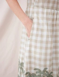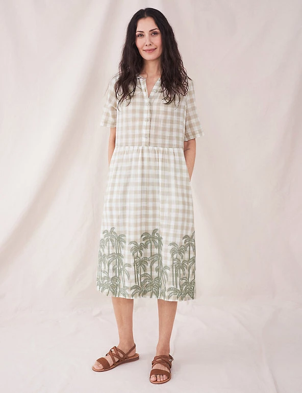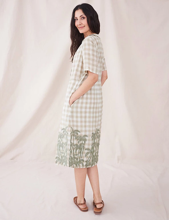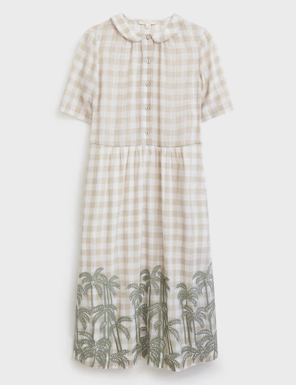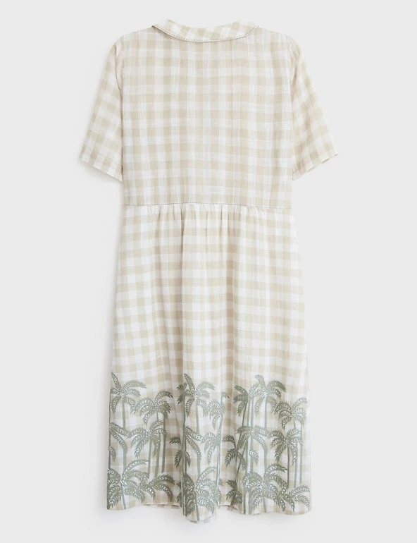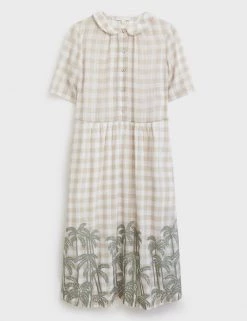 Evoke a tropical feel with this palm-embroidered dress by White Stuff. It’s cut from checked fabric in a comfy regular fit, with a billowy midi skirt. The button-through bodice, short sleeves and Peter Pan collar lend a smart-casual look. The dress is complete with handy slip pockets.