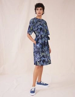 Step out in bold florals this season with this striking pure cotton dress by White Stuff. Its tie waist and wrap knee-length skirt create an elegant silhouette. Flared scallop-trimmed sleeves and a slash neckline add to the feminine appeal.