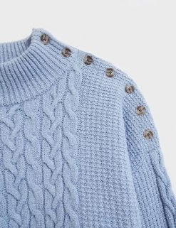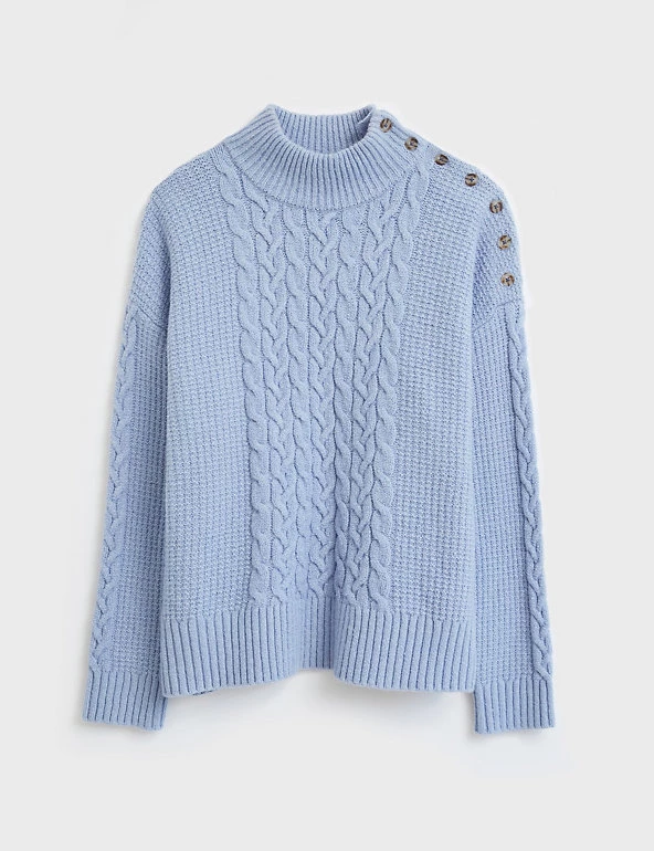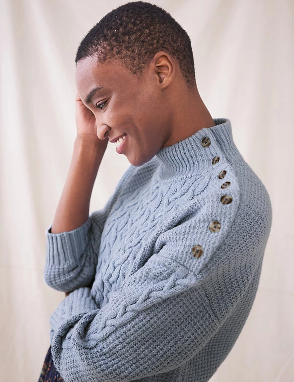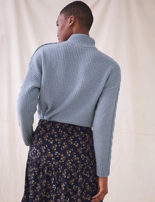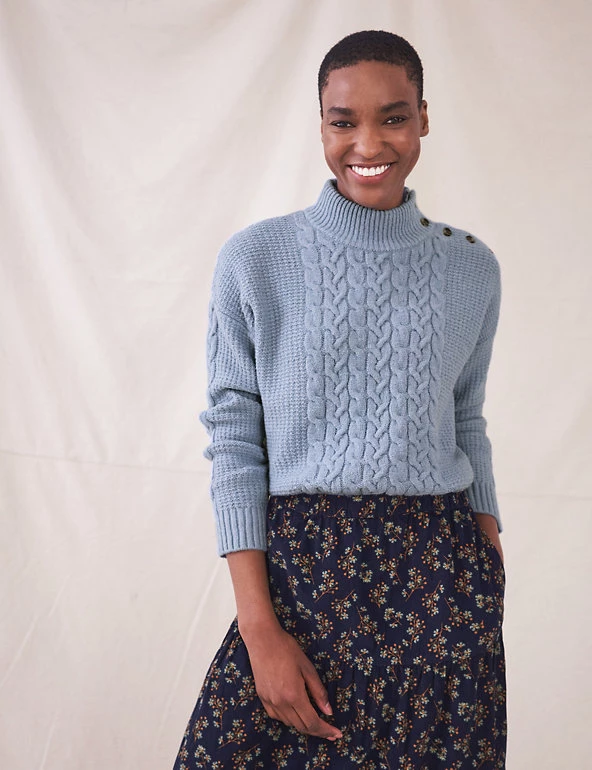 A textured cable knit gives this cotton-rich White Stuff jumper a tactile feel. It’s designed in an easy regular fit, with a warm funnel neck and long sleeves. A mix of cable and waffle stitching adds extra interest, along with unique button detailing on the shoulder.