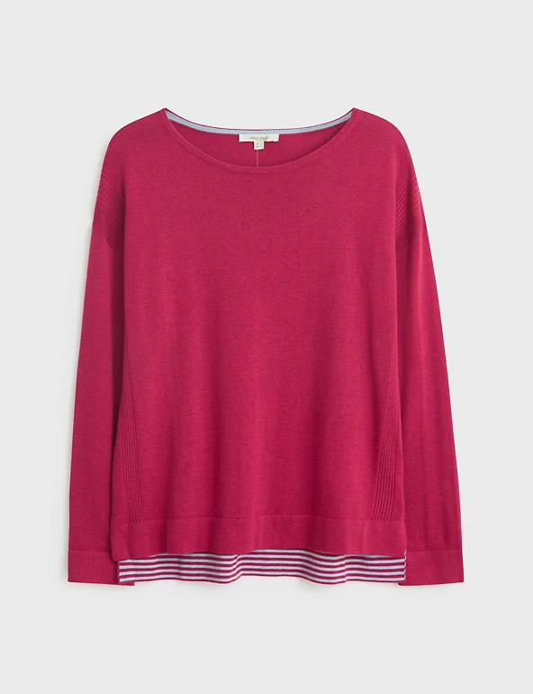 Meet your new favourite cotton-rich jumper from White Stuff. This regular-fit design has a classic crew neck, plus a stepped hem for a flattering finish and easy layering. Ribbed detailing on the sides adds texture, while the sleeves can be rolled back to reveal a pop of contrast stripe print.