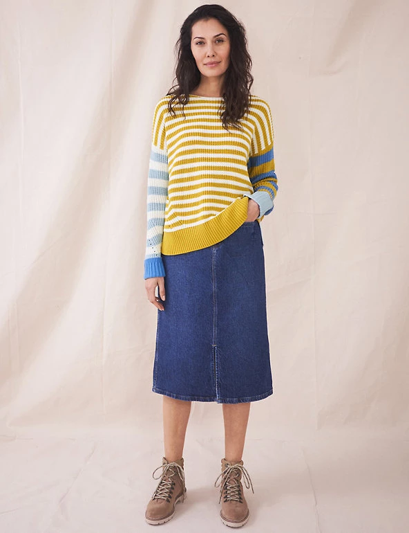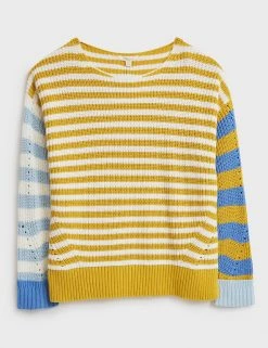 This pure cotton jumper by White Stuff combines colourful stripes for a bold effect. Cut to a regular fit, it’s designed with a crew neck and long, contrast striped sleeves. Ribbed trims give this piece a snug feel, and pointelle detailing adds a traditional touch.