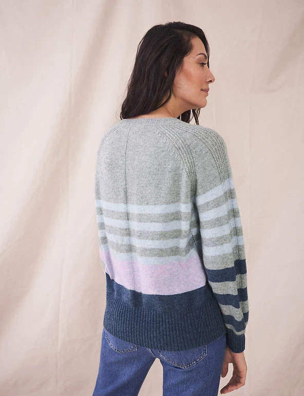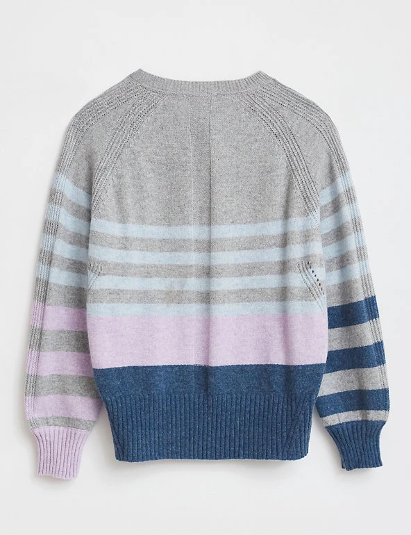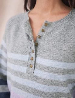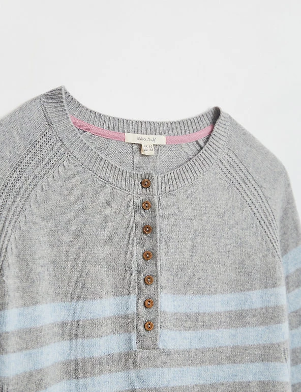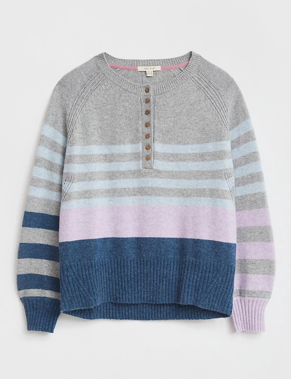 With its cosy wool blend and colourful stripes, this White Stuff jumper is a winner. This regular-fit design features mixed stripes on the bodice and long sleeves, and has Henley-style button fastenings at the crew neck. Ribbed trims and pointelle stitch detailing add the final finishing touches.