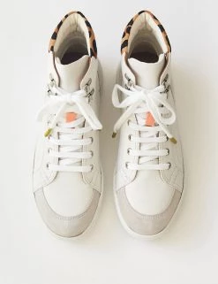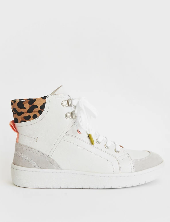 Elevate your everyday trainers with these leather high tops from White Stuff. They’re designed in a comfortable regular fit, with classic lace-up fastenings. There’s plenty of attention to detail on this unique pair, including contrast lace ends and a set of colour pop eyelets. The leopard print ankle padding provides comfort and an eye-catching pattern, while the flat soles are ideal for everyday wear. A colourful pull tab at the back completes the look.