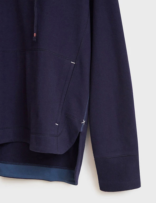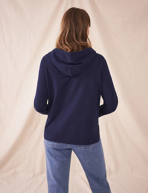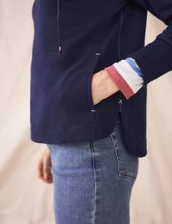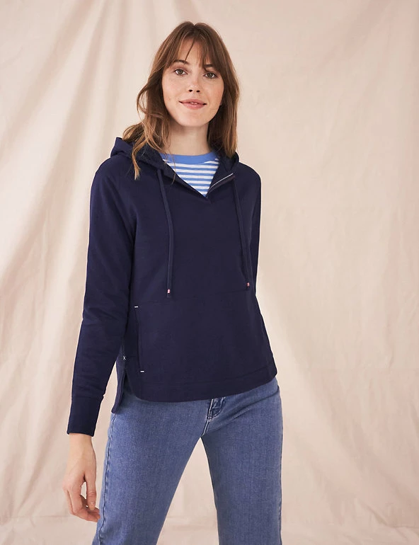 This pure cotton sweatshirts from White Stuff makes a welcome extra layer on cooler days. It’s cut in a comfortable regular fit, with a feminine v-neckline and a dropped hemline that ensures a casual feel. Contrast stitching and a colour-pop lining at the back hem add subtle finishing detail. A generous kangaroo pocket at the front gives room for your essentials.