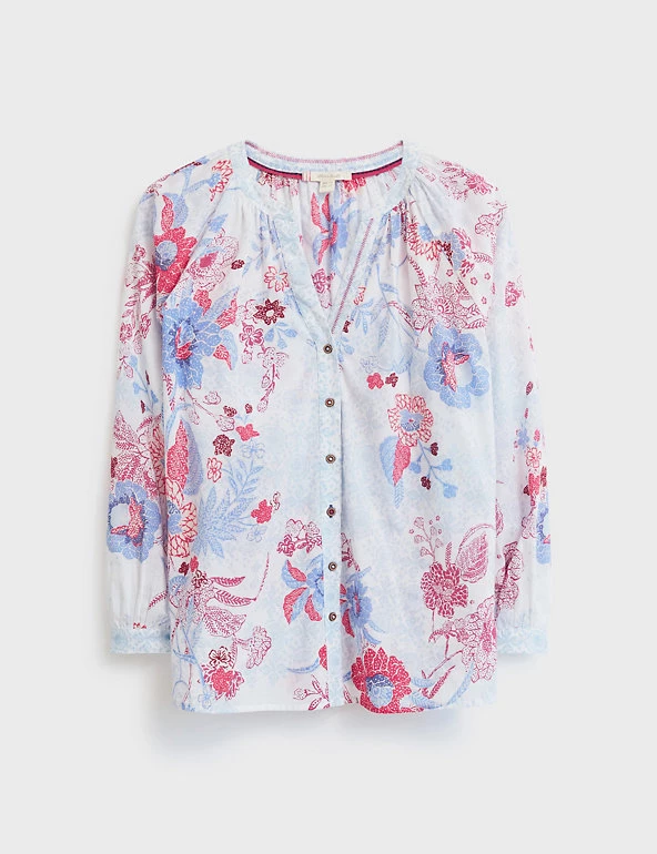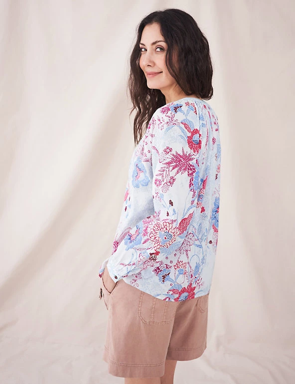 Feel fresh and cool on warmer days in this pure cotton shirt from White Stuff. It’s cut in an easy regular fit, with gathers at the collarless v-neckline for a flowing silhouette. The long raglan sleeves have a touch of pretty fullness, while the curved hem can be worn tucked in or out. Contrast button fastenings add a neat finishing detail.