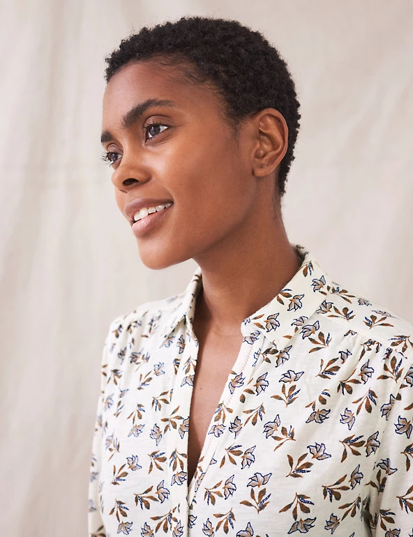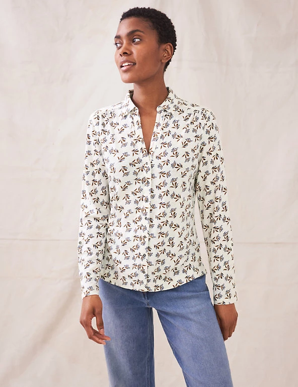 This shirt by White Stuff gives a nod to nature with its pretty print. It’s designed in a regular fit and features subtle gathers on the shoulders. The long sleeves can be rolled back and secured with buttons for a laidback feel. The shirt is framed by a neat collared v-neckline and made from pure cotton jersey for comfortable wear.